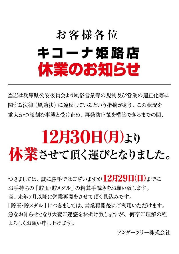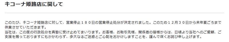 キコーナ姫路店の営業停止180日による不安視